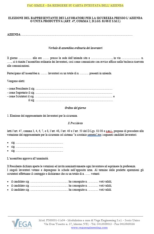 Per Verbalizzare l’elezione del Rappresentante dei Lavoratori per la Sicurezza (RLS) per l’azienda o l’unità produttiva da parte dei Lavoratori, che si riuniscono in assemblea ordinaria, Vega Engineering ha predisposto un facsimile di verbale.
